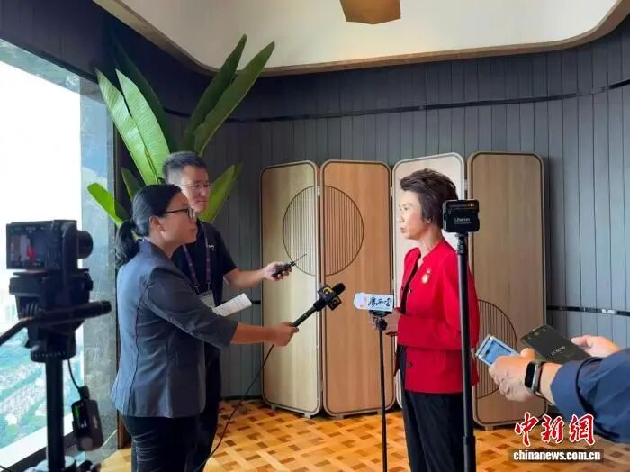 图为新加坡贸易与工业部兼文化、社区及青年部高级政务部长刘燕玲在第22届东博会会期接受采访。韦佳秀 摄