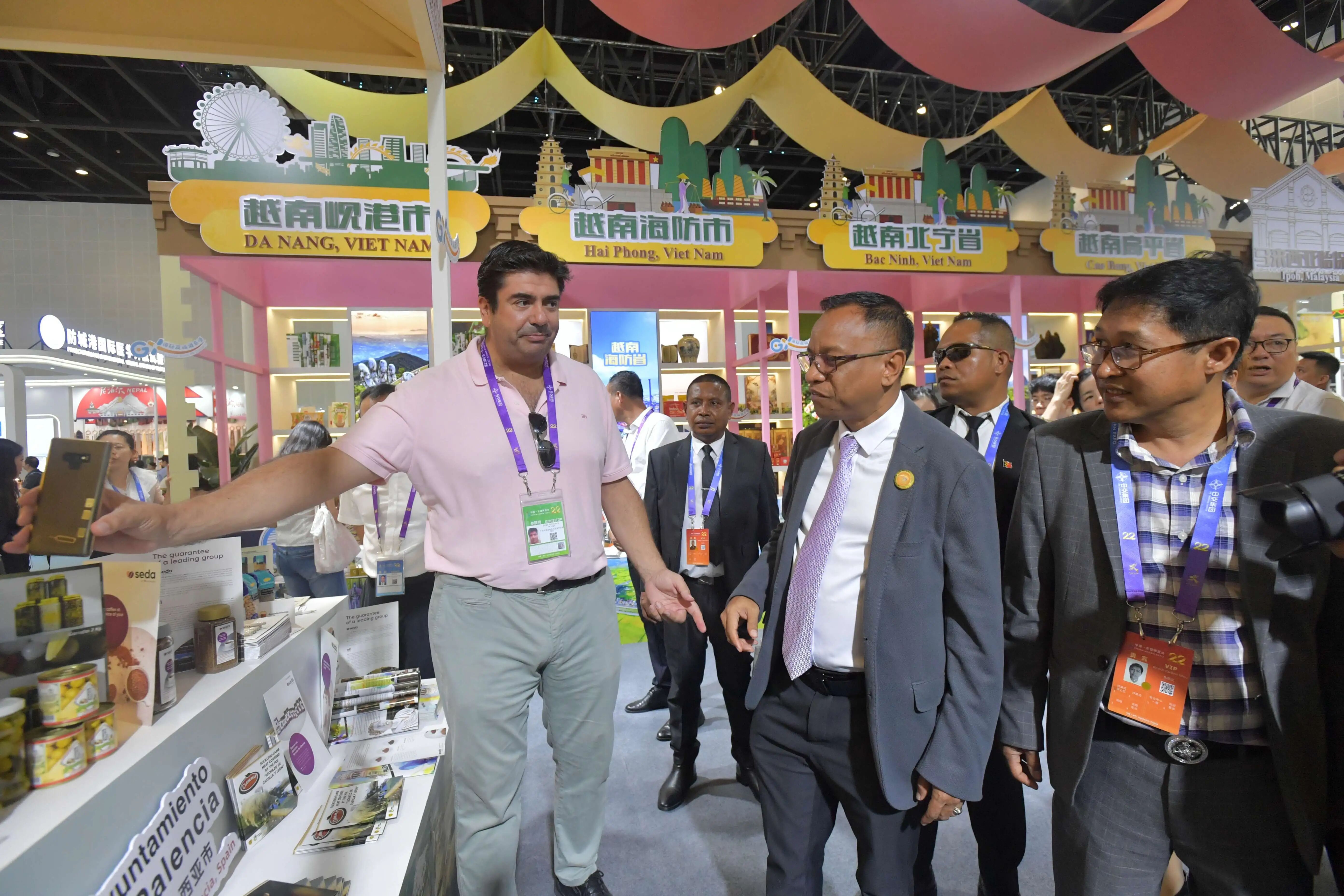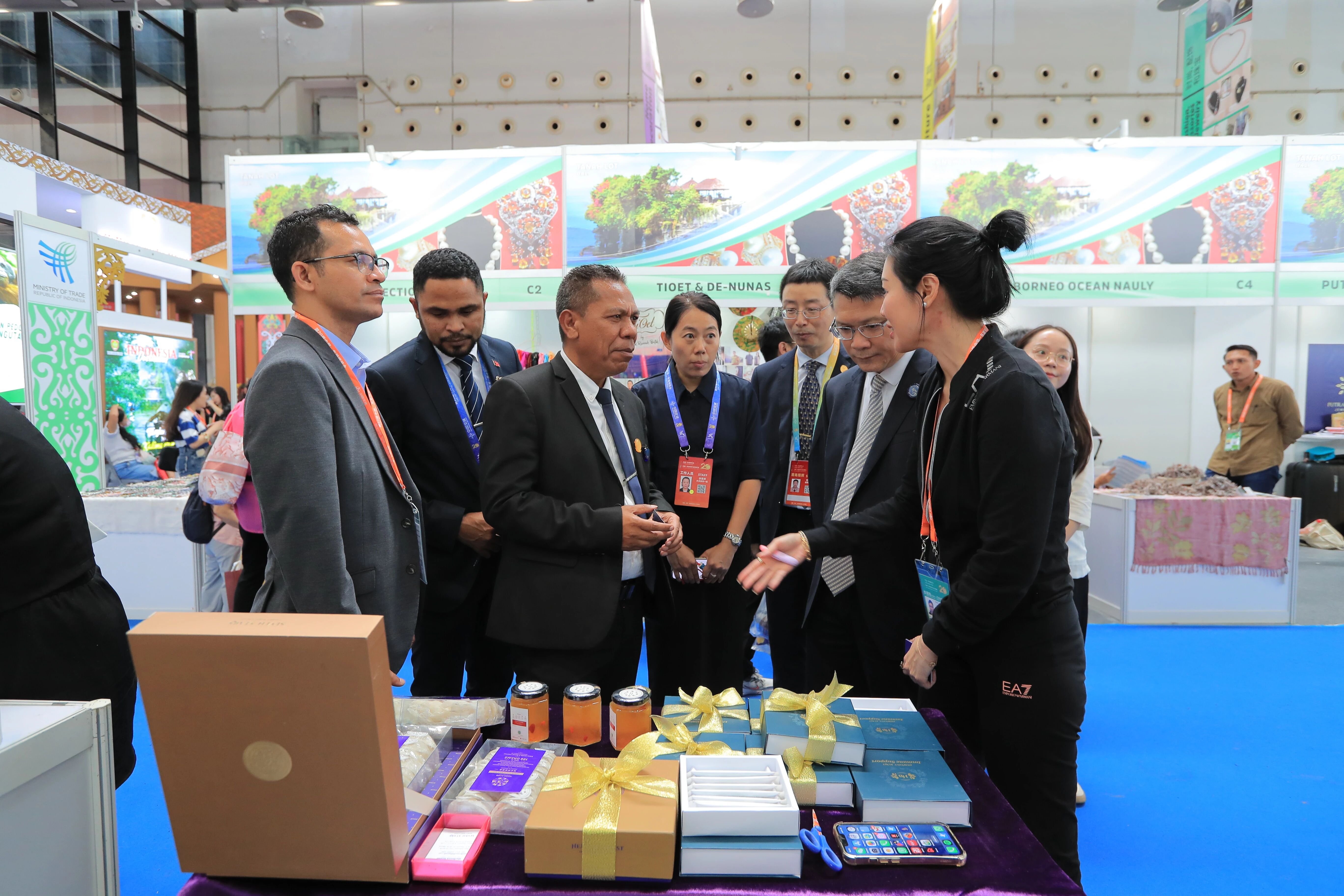 2025年,东帝汶贸易与工业部部长菲利普斯·尼诺·佩雷拉(图右2)率团参观第22届东博会商品展区。