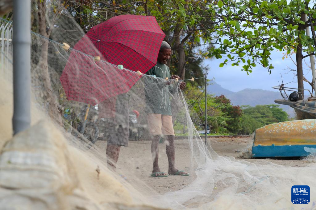 9月17日,在东帝汶帝力海边,一名老人修补渔网。新华社记者 岑云鹏 摄