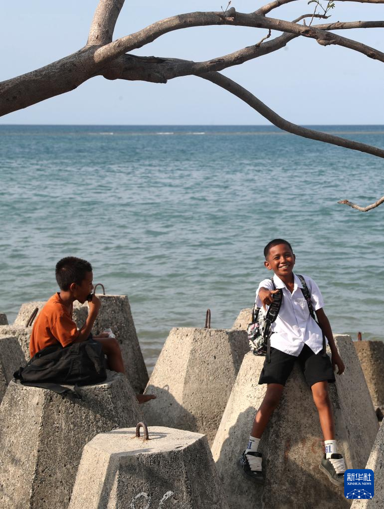 9月17日,在东帝汶帝力,两名儿童在海边玩耍。新华社记者 岑云鹏 摄