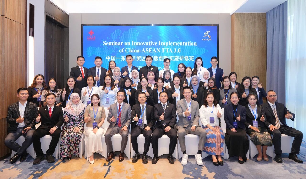 11月24日,由商务部主办、中国—东盟博览会秘书处承办的2025年中国—东盟自贸区3.0版创新实施研修班正式启动。东博会秘书处副秘书长成功出席研修班开班仪式。本次研修班吸引了来自文莱、柬埔寨、印尼、老挝、马来西亚、缅甸、菲律宾、泰国、越南等东盟9国及东盟秘书处的41名学员参加。