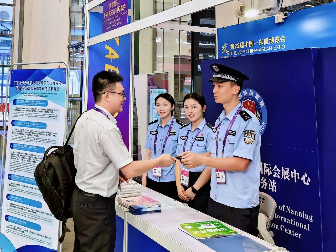 此外,南宁警方还在会场内设置外国人服务站,同时组建了一支由外语特长民警和外语特长志愿者组成的39人涉外服务队,为外籍参展商和宾客提供方便快捷的多语种翻译、办证答疑等服务。