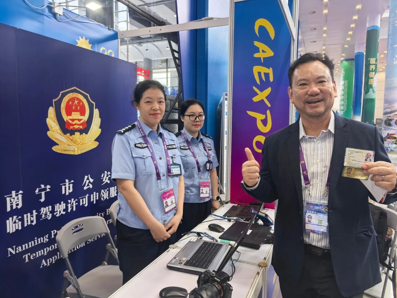 ▲东博会期间,南宁警方在国际会展中心设服务台为境外人员办理临时驾驶许可证。甘丽佳 摄